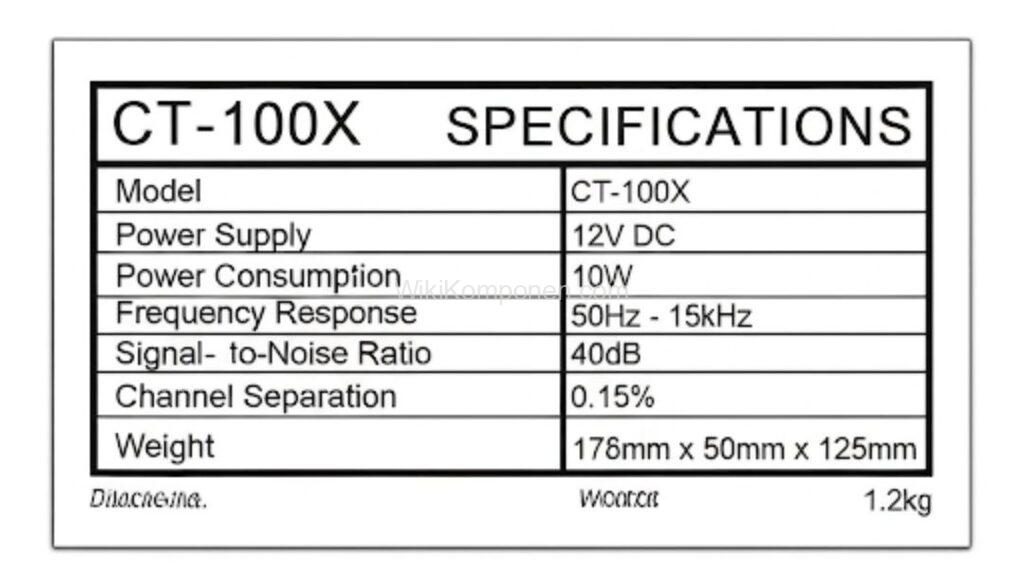 Spesifikasi Teknis tape mobil dapat ditemukan di samping atau di bagian panel belakang tape mobil. Berikut ini adalah salah satu contoh label tape mobil CT-100X